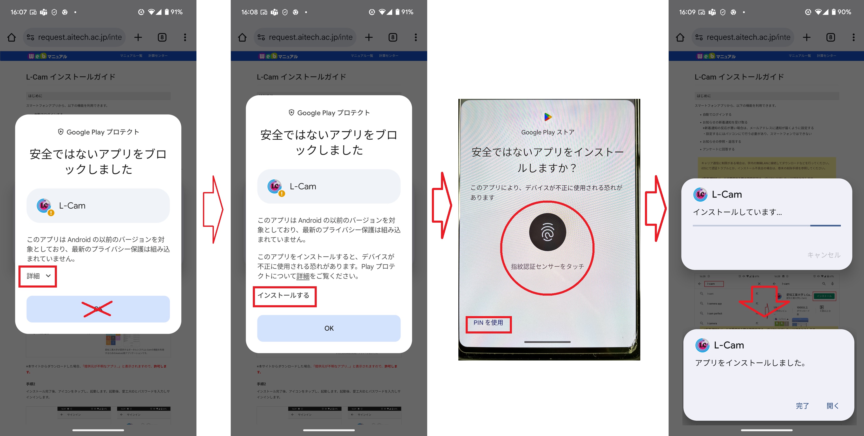 注)「安全ではないアプリをブロックしました」と表示された時に下に表示される「OK」ボタンと押すと、インストールされませんので、再度ダウンロードし、やり直してください。