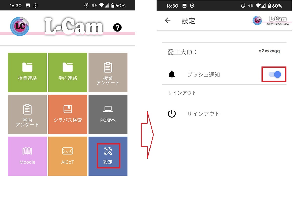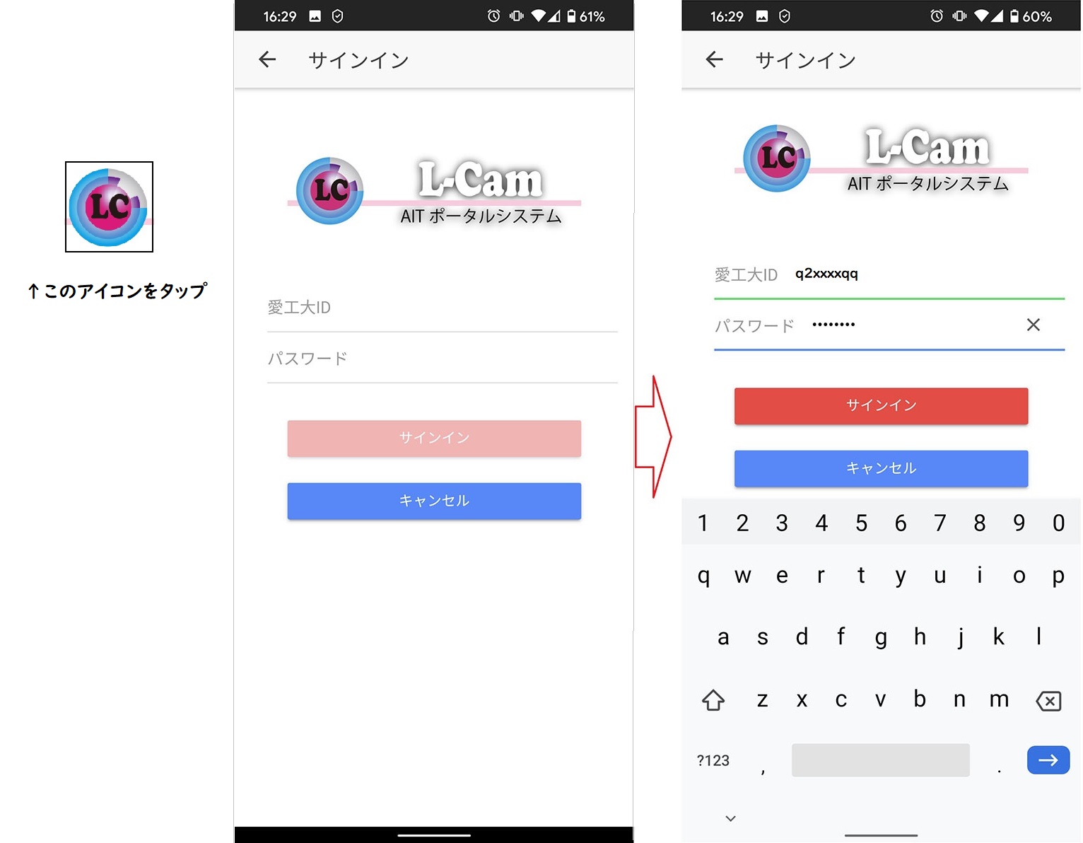 インストール完了後、アイコンをタップし、起動します。起動後、愛工大IDとパスワードを入力しサインインします。