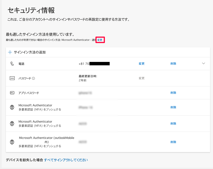 - 旧端末を探し、「Microsoft Authenticator」の項目の右端にある「削除」をクリック。