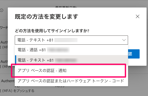 規定の認証方法を アプリベースの認証 - 通知にします。